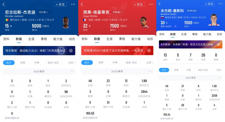 切尔西内部坚称杰克逊的价值应高于埃基蒂克和塞斯科,但低于伊萨克。数据佐证了这一点:过去两赛季杰克逊联赛65场24球;在实力稍弱的德甲,塞斯科64场27球,埃基蒂克47场19球;而伊萨克在纽卡64场44球,近两倍身价也算合理。